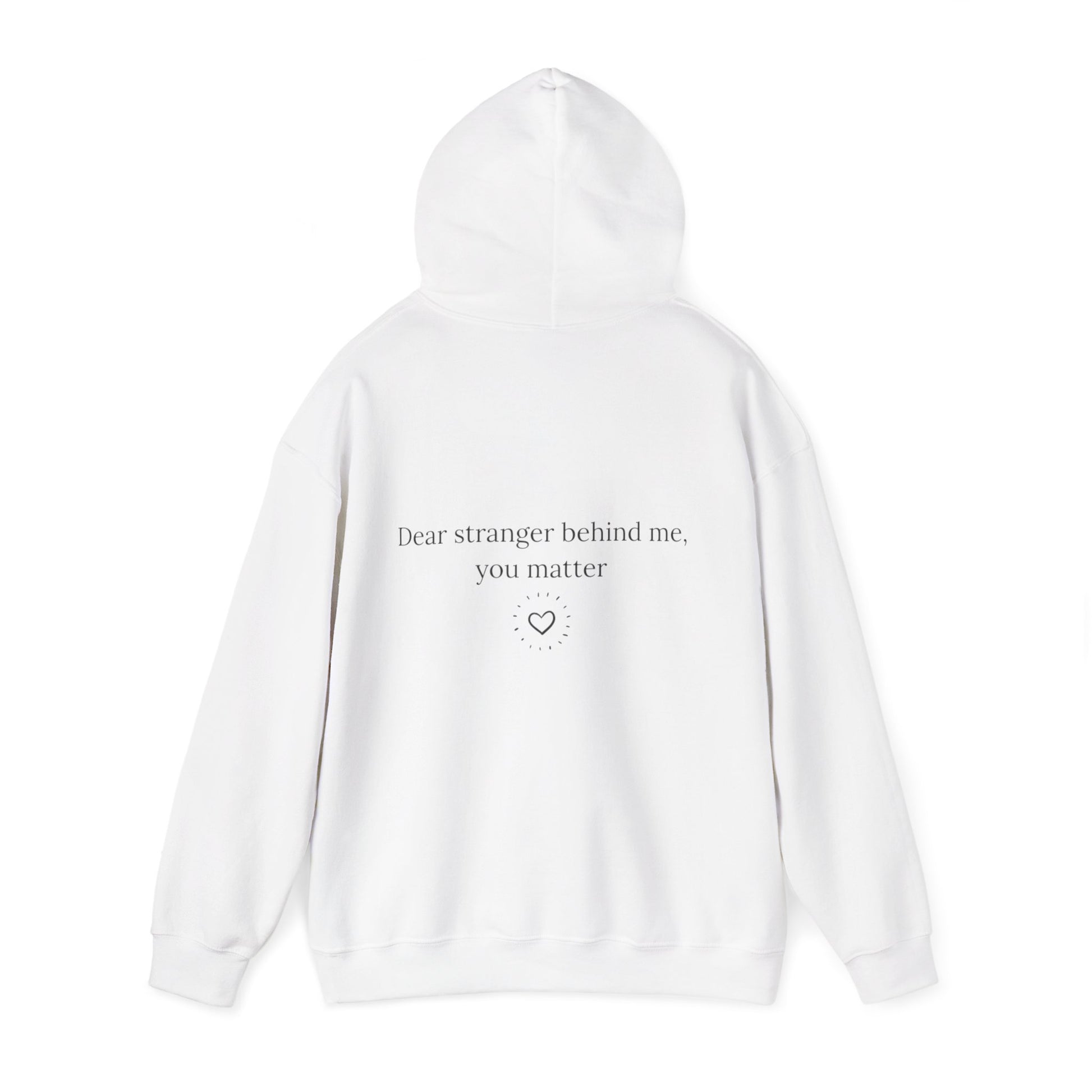Embrace warmth and comfort with this unisex heavy blend hooded sweatshirt. Ideal for chilly days, it features a spacious kangaroo pouch to keep your hands snug, and an adjustable drawstring hood for a tailored fit. With its smooth fabric and classic style, it offers a cozy, relaxed vibe that's perfect for lounging at home or casual outings. The heartfelt message 'Dear stranger behind me, you matter' adds a touch of inspiration to your day-to-day wear. Perfect for individuals who appreciate thoughtful design, it’s a wonderful gift for friends, family, or even yourself during holidays like Valentine's Day, or as a comforting wear during colder months. Enjoy versatile style that's as meaningful as it is comfortable!